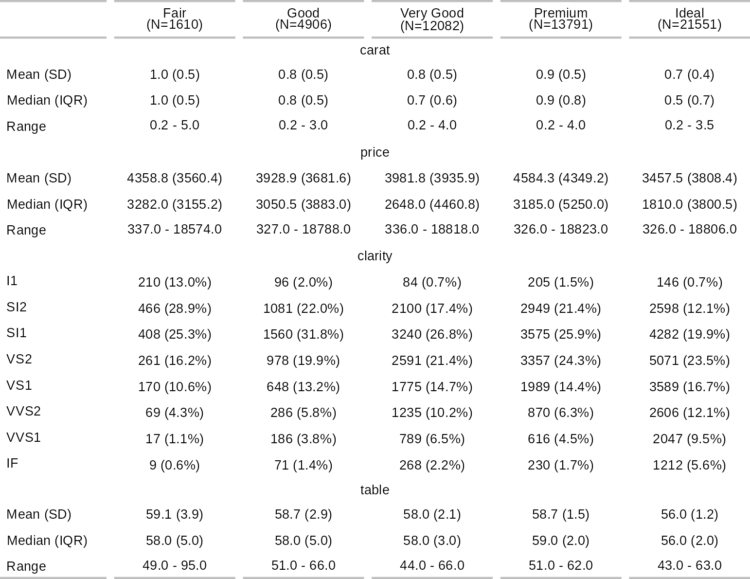 ggplot2::diamonds[, c("cut", "carat", "price", "clarity", "table")] |>
