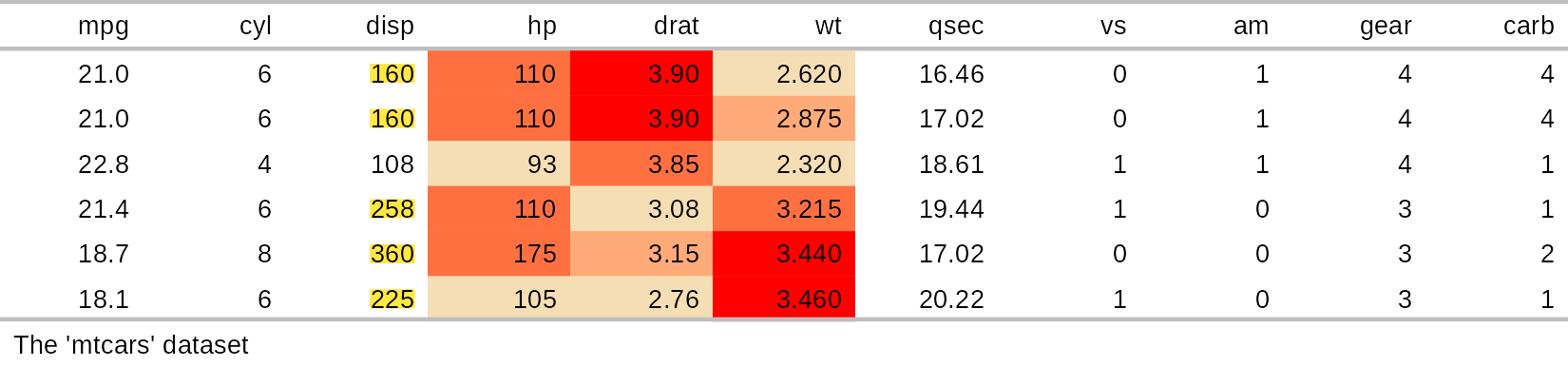 highlight(i = ~ mpg < 22, j = "disp", color = "#ffe842") |>